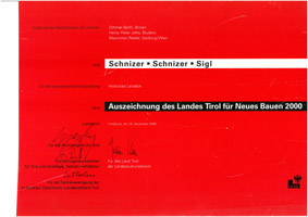 awards: internat. Architekturpreis für Neues Bauen in den Alpen 1999 / Auszeichnung d. Landes Tirol für Neues Bauen 2000
